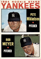 Bob Meyer appeared in a career-high 22 games in 1964, pitching for three different teams. He made his big league debut on April 20, 1964, as the starting pitcher for the Yankees, and struck out Carl Yastrzemski (#385) for his first career strike out. Meyer was sold to the Angels on June 12th and then sold again the Athletics on July 29th. He'd spend the next four-plus seasons pitching in the Athletics' minor league system before getting a shot in the majors again with the expansion Pilots. On August 29, 1969, Meyer and Pete Koegel were dealt to Seattle in exchange for pitcher Fred Talbot (#58). Meyer appeared in six games for the Pilots with the highlight being a nine-inning performance against his original team, the Yankees, on September 1st and a complete game against his most recent former team, the Athletics. The following season, Meyer pitched two innings in the first ever Brewers game on opening day 1970. He'd appear in only nine more games for Milwaukee before his big league career ended. Meyer went 2-12 in 38 games with a 4.38 ERA over 129 1/3 innings pitched.